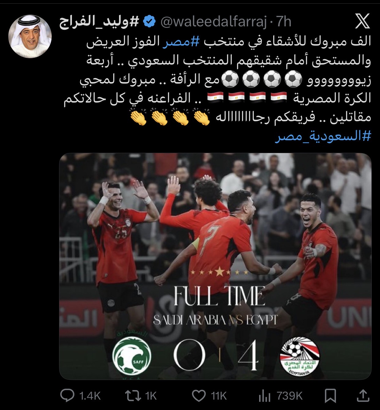 وكتب الإعلامي السعودي وليد الفراج عبر حسابه علي منصة إكس: “الف مبروك للأشقاء في منتخب مصر الفوز العريض والمستحق أمام شقيقهم المنتخب السعودي”.