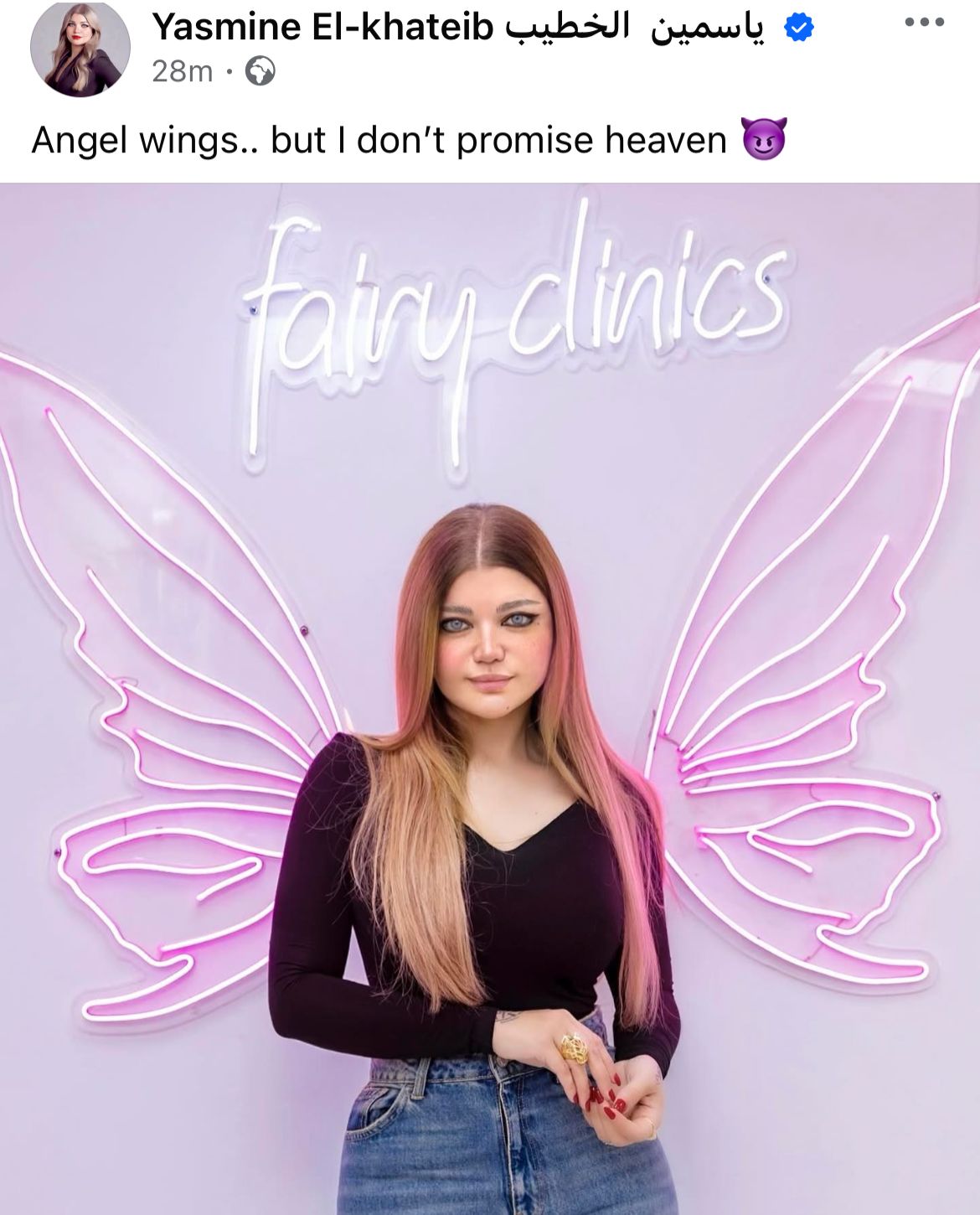 وتألقت ياسمين الخطيب في أحدث ظهور بملامح طبيعة دون التكلف في مستحضرات التجميل، واعتمدت على لوك كاجوال عصري بتوب أسود وجينز، وعلقت: “جناح ملائكي لكني لا أعدك بالجنة”.