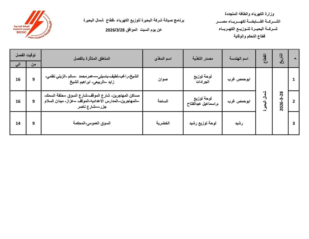 وتهيب شركة البحيرة لتوزيع الكهرباء بالسادة المواطنين والمستشفيات والمخابز والمنشآت الخدمية الواقعة في المناطق المتأثرة، اتخاذ التدابير اللازمة وتدبير احتياجاتهم من الكهرباء خلال فترة الانقطاع المعلن عنها، على أن يعود التيار بانتظام فور الانتهاء من أعمال الصيانة الفنية.