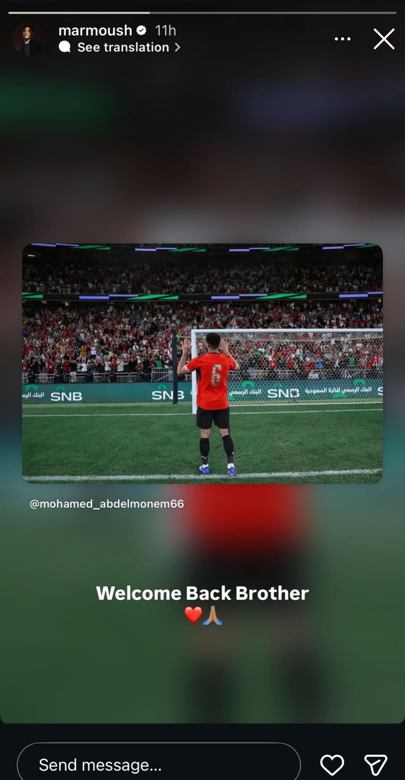 وشارك مرموش صورة للاعب محمد عبد المنعم، وكتب: “مرحبا بعودتك أخي”.