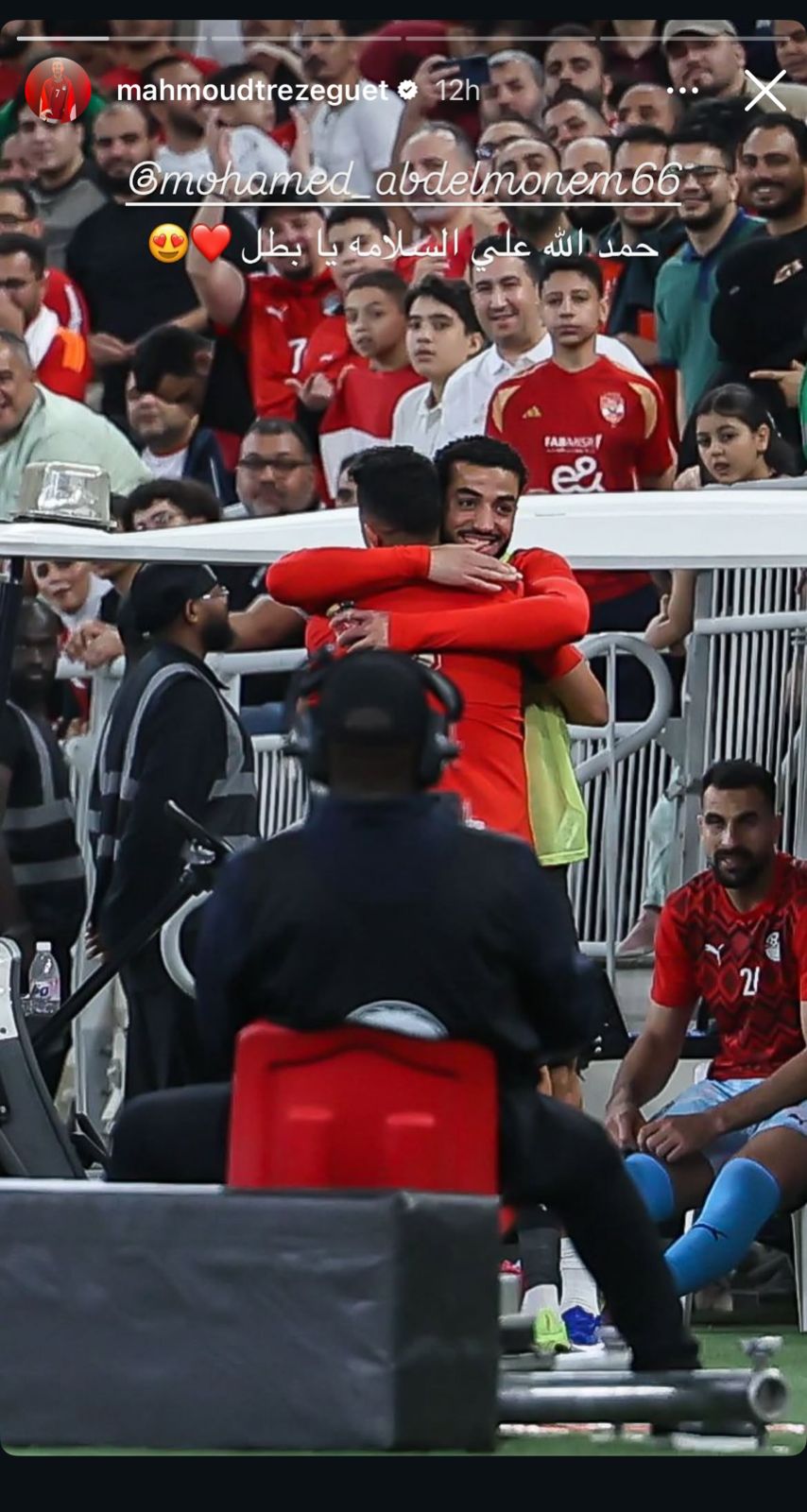 وكتب تريزيجية عبر حسابه على انستجرام رسالة لمحمد عبد المنعم: “حمد الله على السلامة يا بطل”.