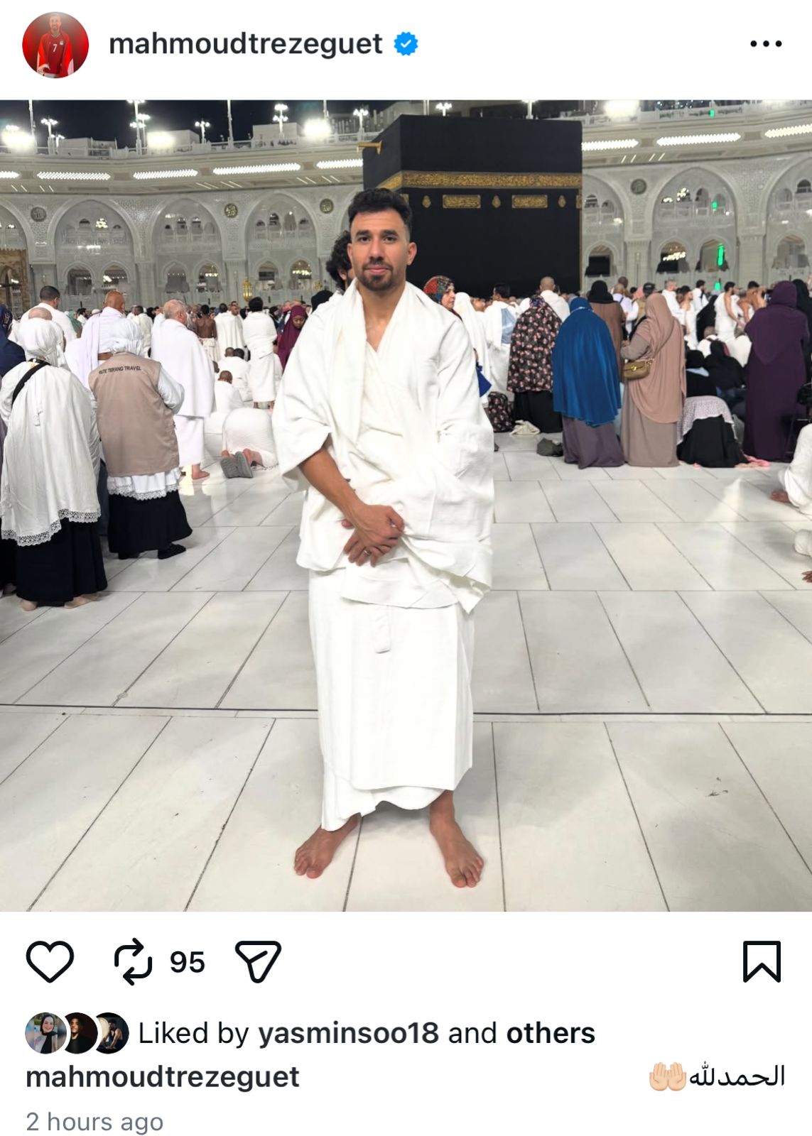 وظهر تريزيجية بملابس الإحرام أمام الكعبة اثناء اداء مناسك العمرة، وعلق على انستجرام: “الحمد لله”.