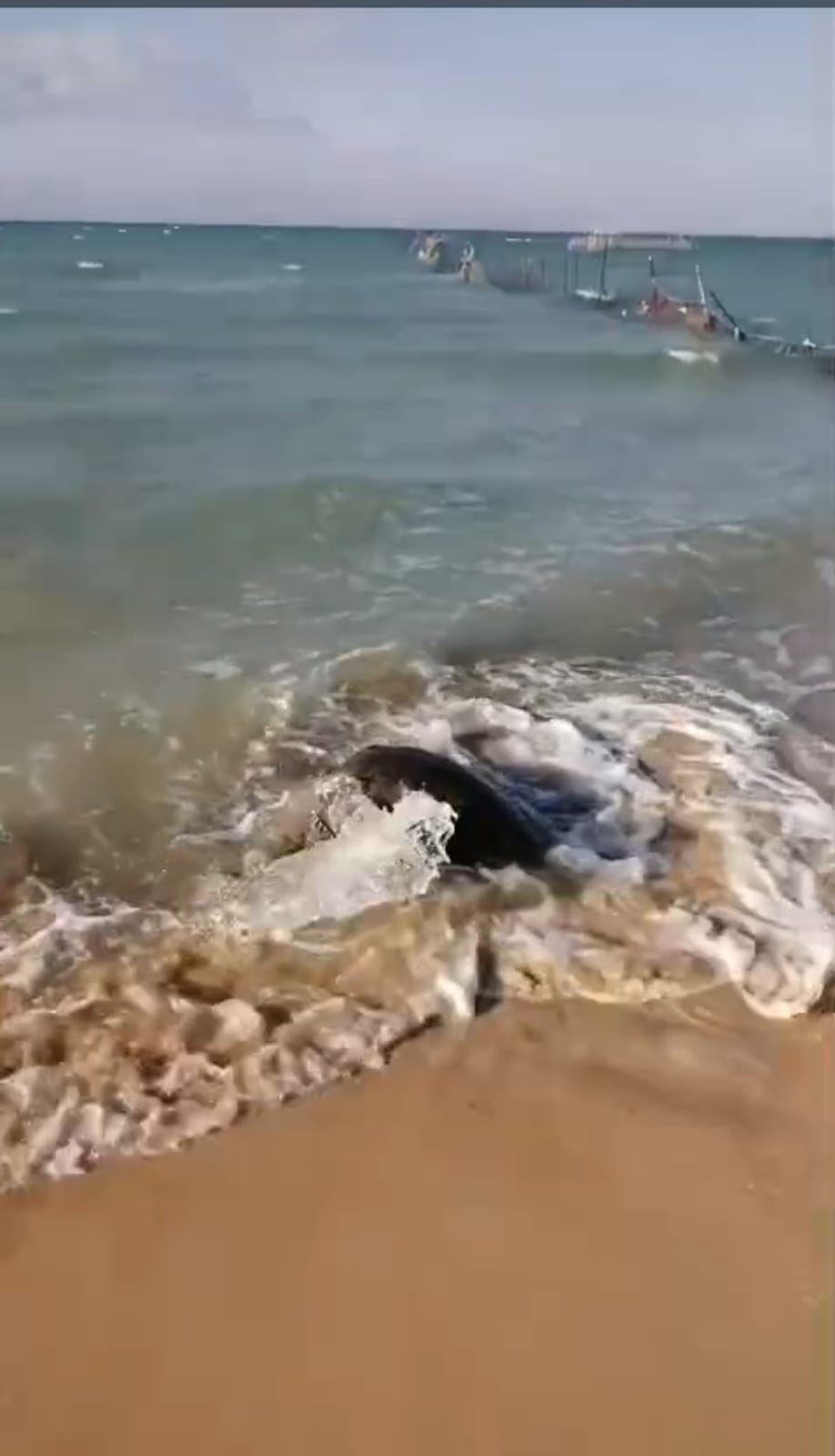 ، ما أدى إلى اندفاع السلحفاة خارج بيئتها البحرية واستقرارها على الشاطئ، حيث علقت بمعدات الصيد.