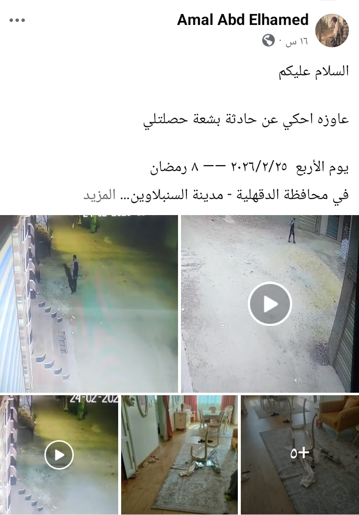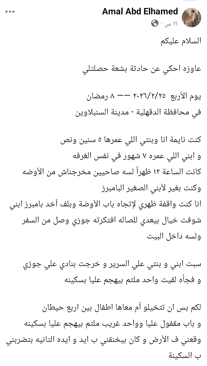 روت سيدة بمدينة السنبلاوين بمحافظة الدقهلية واقعة مأساوية، عبر حسابها على فيس بوك بعدما تعرضت سيدة لمحاولة قتل وسرقة بالإكراه داخل منزلها، أثناء تواجدها مع أطفالها.