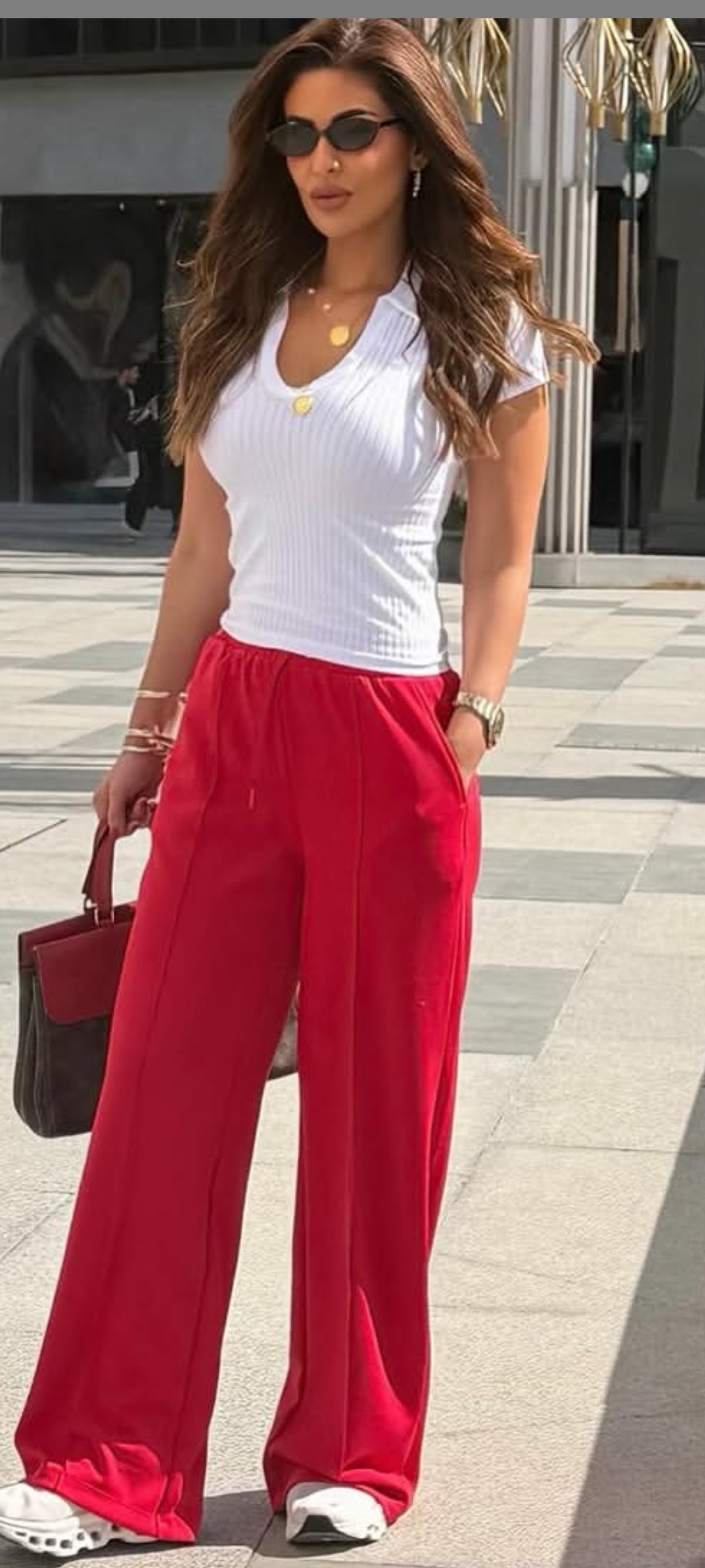 وظهرت مي سليم، مرتديه بنطال رياضي كاجوال باللون الاحمر، ونسقت معه توب باللون الابيض ليكشف عن رشاقتها .
