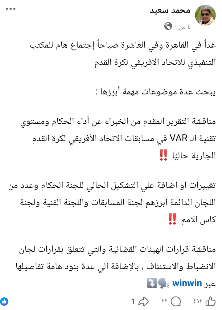 أعلن الإعلامي محمد سعيد، مقدم برنامج "التريند" على قناة الأهلي، أن اجتماعًا هامًا للمكتب التنفيذي للاتحاد الأفريقي لكرة القدم سيُعقد غدًا في القاهرة.