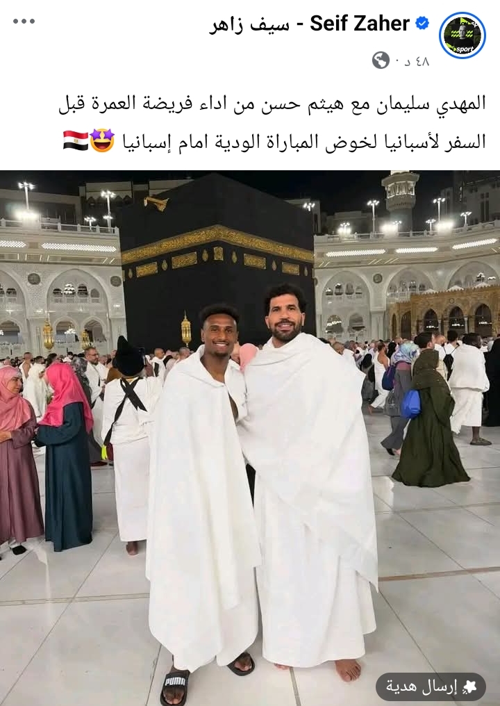 وكتب سيف زاهر عبر حسابه علي فيسبوك "المهدي سليمان هيثم حسن من اداء فريضة العمرة قبل السفر لأسبانيا لخوض المباراة الودية امام إسبانيا"