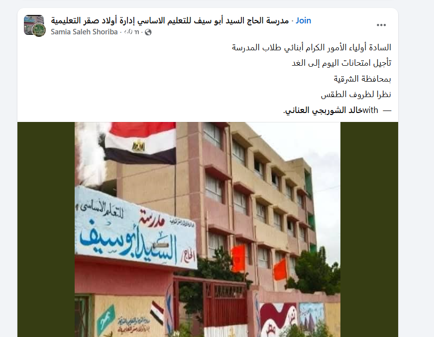 وعلى جانب آخر ، كان قد أعلن الدكتور المهندس حسام عبد الفتاح، محافظ القليوبية، عن تعطيل الدراسة اليوم بجميع مدارس المحافظة ، على أن يكون تعطيل الدراسة لمدة يوم واحد، وذلك نظرًا لسوء الأحوال الجوية التي تشهدها البلاد، وحرصًا على سلامة الطلاب.