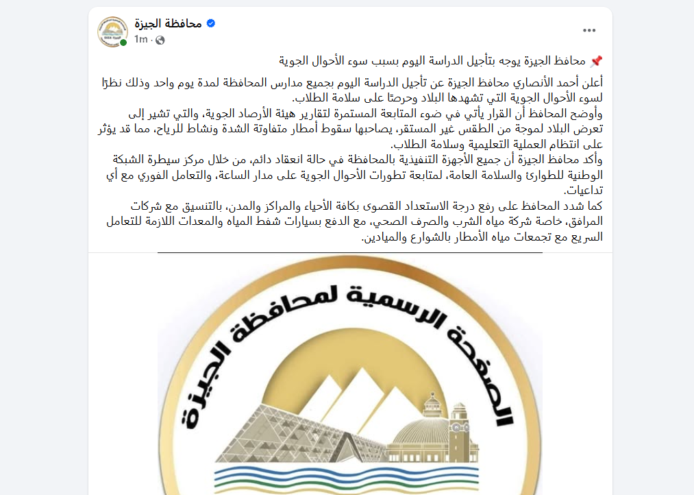 ومن جانبه .. أعلن أحمد الأنصاري محافظ الجيزة عن تعطيل الدراسة اليوم بجميع مدارس المحافظة لمدة يوم واحد وذلك نظرًا لسوء الأحوال الجوية التي تشهدها البلاد وحرصًا على سلامة الطلاب.