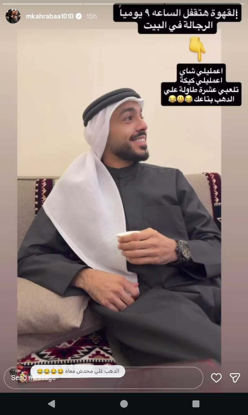 وظهر كهربا مرتدي الملابس السعودي، معلقاً:"القهوة هتقفل الساعه 9 يوميا الرجالة في البيت،اعمليلي شاي اعمليلي كيكة تلعبي عشرة طاولة علي الدهب بتاعك ...".