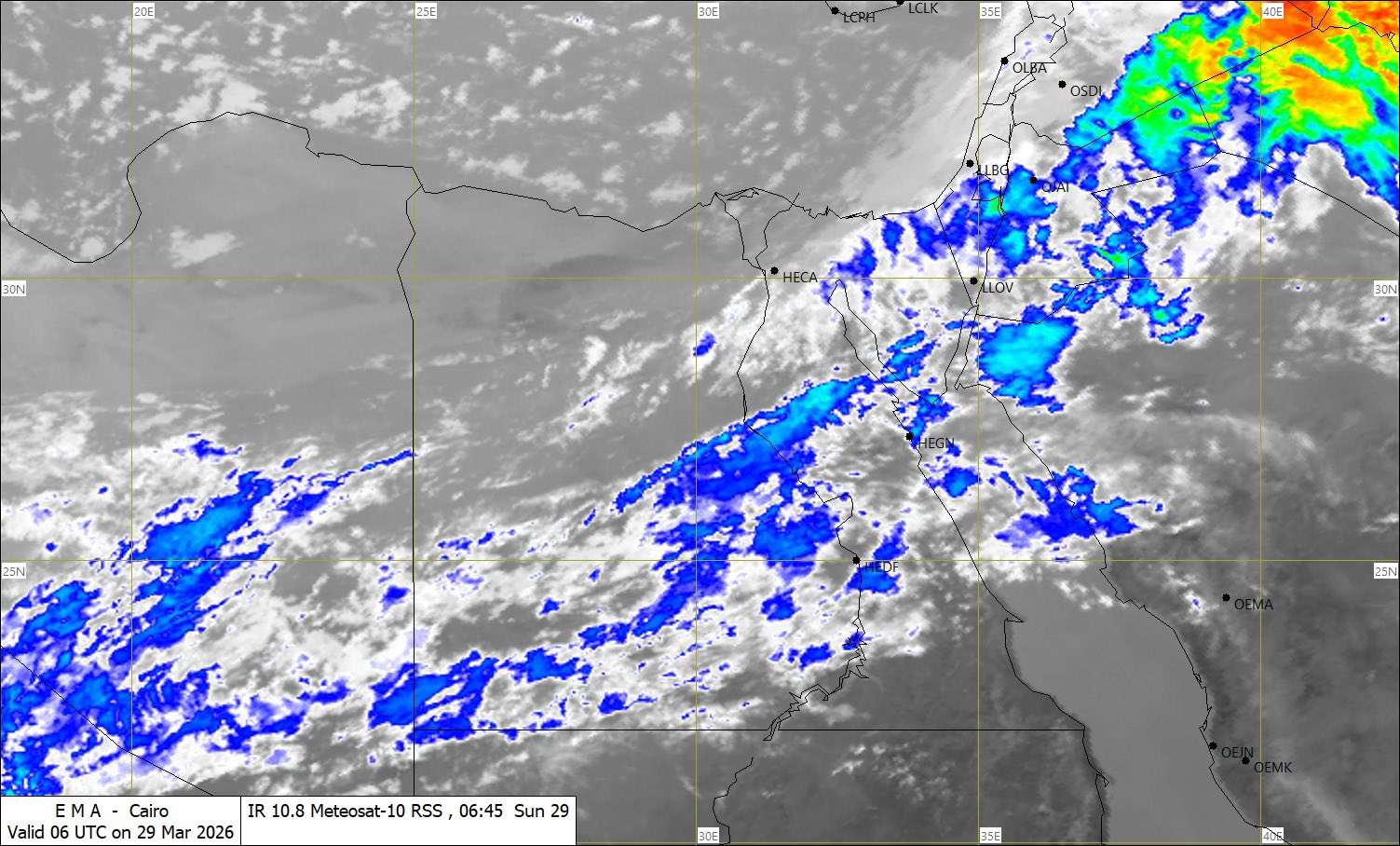قالت هيئة الأرصاد، إن آخر صور الأقمار الصناعية تشير إلى تدفق السحب المنخفضة والمتوسطة على مناطق من السواحل الشمالية الغربية وشمال الوجه البحرى يصاحبها سقوط الأمطار مع تقدم الوقت .