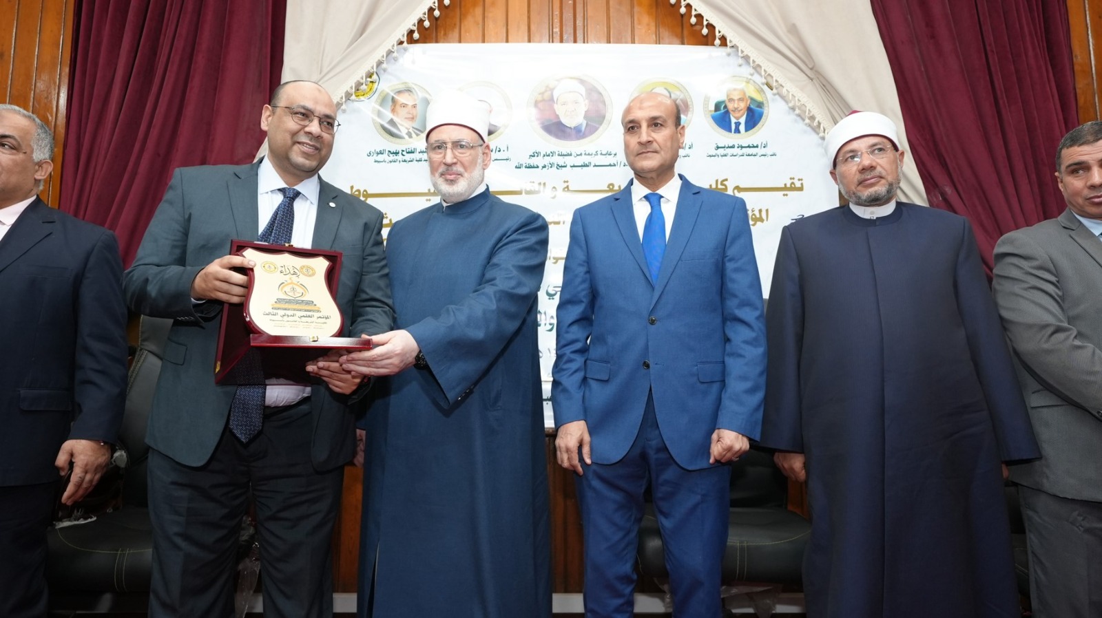 وفي نهاية الحفل قدم عميد كلية الشريعة والقانون الدروع التذكارية للوزير المحافظ اللواء محمد علوان، وفضيلة الدكتور محمد الضويني وكيل الأزهر الشريف، والسادة أعضاء المنصة الكريمة .