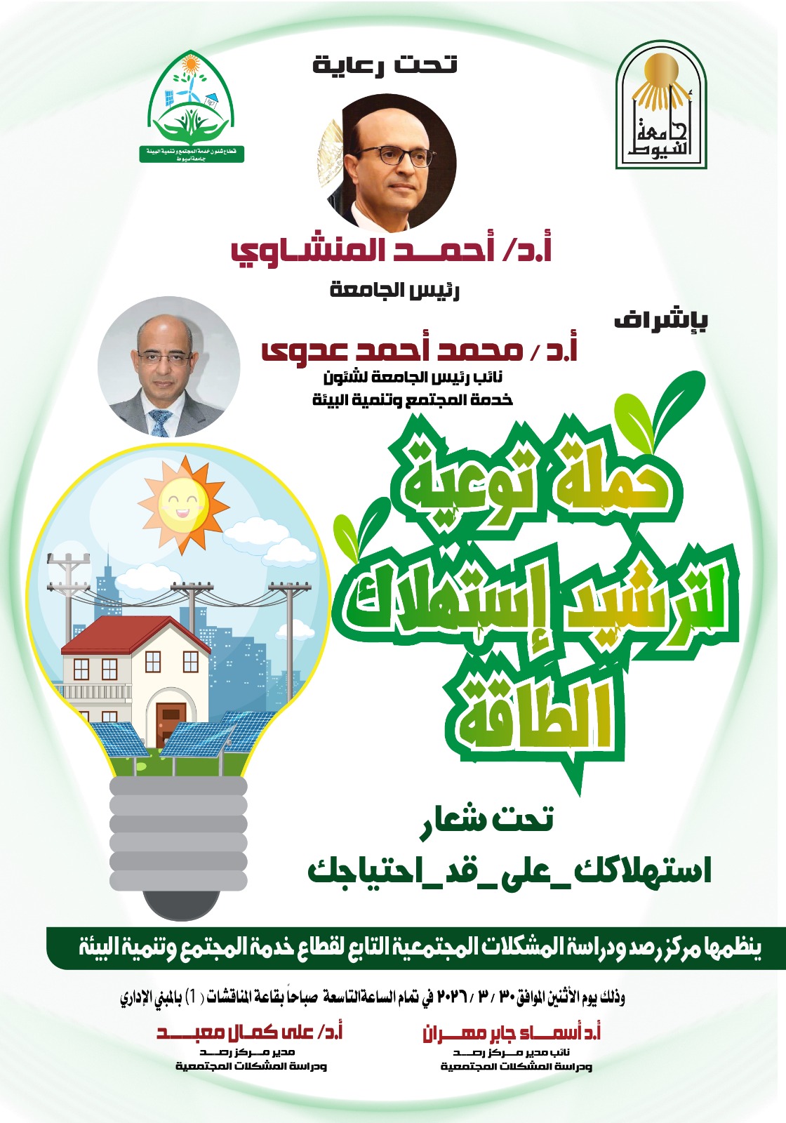 وتأتي الحملة انطلاقًا من الدور المجتمعي الذي تقوم به جامعة أسيوط في مواجهة التحديات المعاصرة، وفي مقدمتها قضايا الطاقة والحفاظ على الموارد، حيث تستهدف رفع مستوى الوعي لدى أعضاء هيئة التدريس والعاملين بالجامعة بأهمية الاستخدام الأمثل للطاقة، والحد من السلوكيات غير الرشيدة التي تؤدي إلى إهدارها.