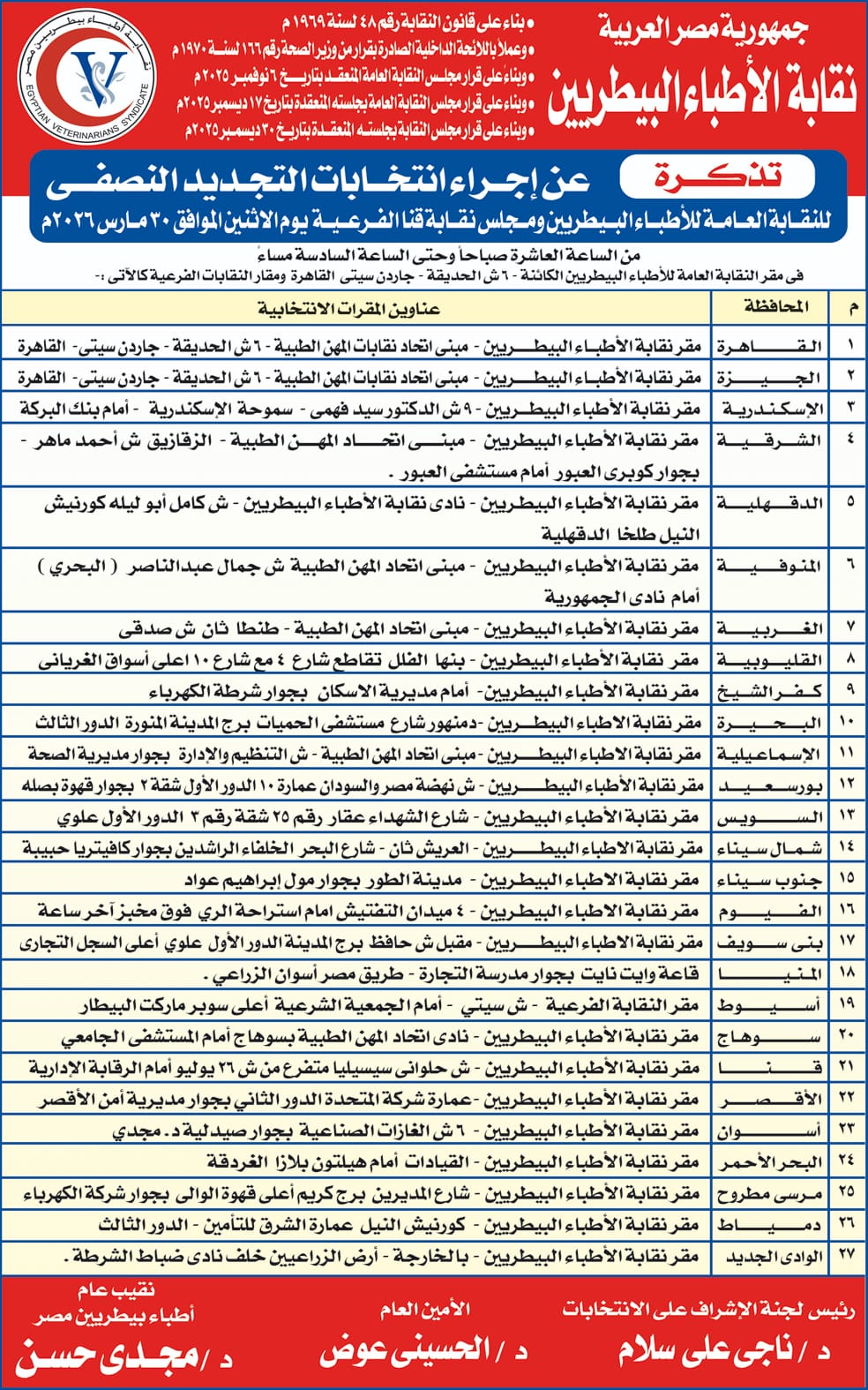 تعقد غدا، الاثنين 30 مارس 2026، انتخابات التجديد النصفي للنقابة العامة للأطباء البيطريين ومجلس نقابة قنا الفرعية.