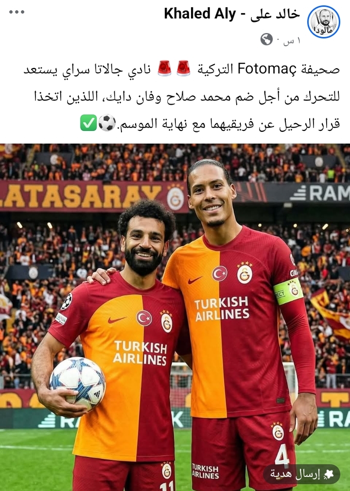 وكتب الناقد الرياضي خالد علي عبر حسابه علي فيسبوك "صحيفة Fotomaç التركية نادي جالاتا سراي يستعد للتحرك من أجل ضم محمد صلاح وفان دايك، اللذين اتخذا قرار الرحيل عن فريقيهما مع نهاية الموسم".