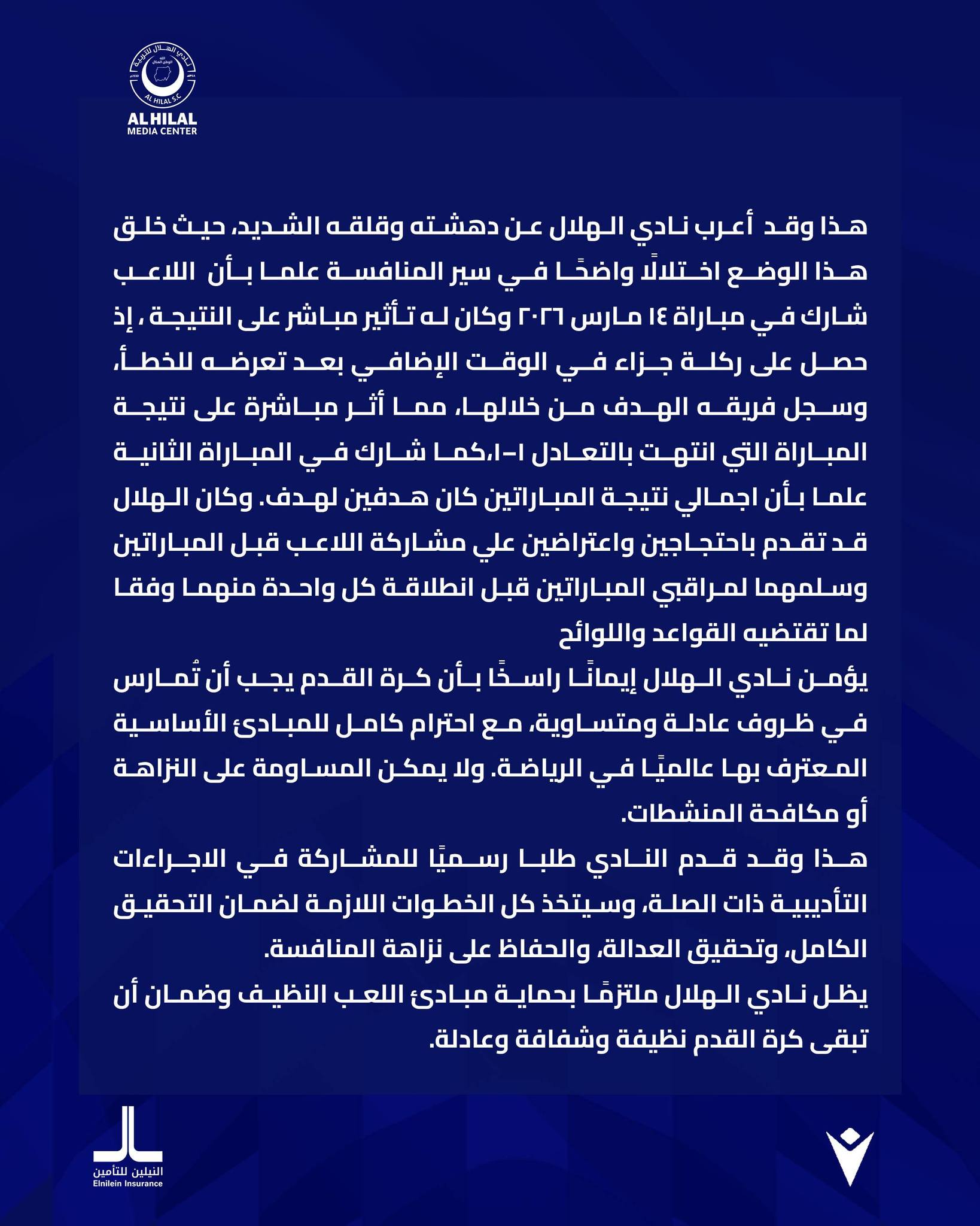 وصف الهلال هذه الخطوة بأنها انتهاك جسيم لمبادئ النزاهة وتوازن المنافسة، مؤكدًا أن كرة القدم يجب أن تمارس في ظروف عادلة ومتساوية، مع احترام كامل للمعايير الدولية.