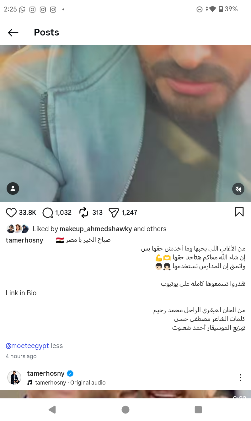 وكتب تامر حسنى عبر صفحته على موقع التواصل الاجتماعي إنستجرام:"صباح الخير يا مصر من الأغانى اللى بحبها وما أخدتش حقها بس إن شاء الله معاكم هتاخد حقها وأتمنى إن المدارس تستخدمها".