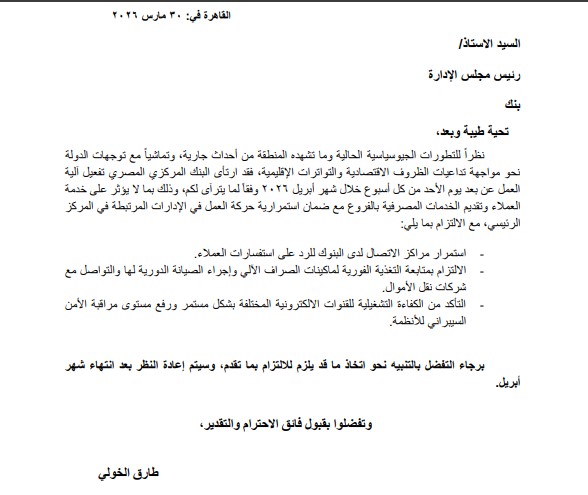 وشددت تعليمات طارق الخولي المرسلة لرؤساء البنوك قبل قليل بضرورة الالتزام بما يلي: