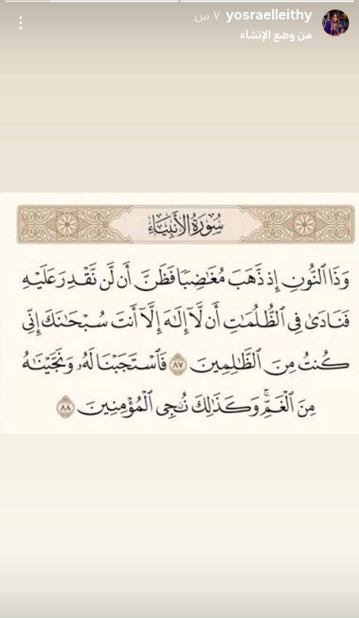 وشاركت يسرا الليثي زوجة أحمد حسام ميدو عبر حسابها على انستجرام آيات قرآنية بعد حبس نجلها.