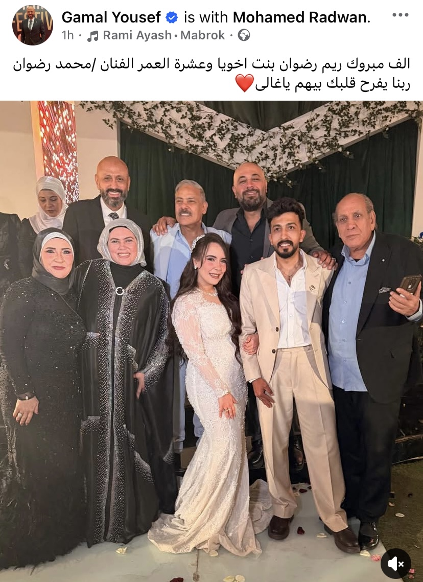 ووجه الفنان جمال يوسف تهنئة للعروسين ومشاركة صورة من الخطوبة، وعلق قائلاً: " الف مبروك ريم رضوان بنت اخويا وعشرة العمر الفنان محمد رضوان ربنا يفرح قلبك بيهم ياغالى".