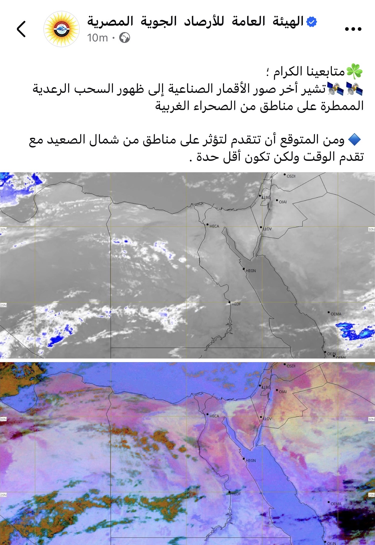أعلنت الهيئة العامة للأرصاد الجوية المصرية، عن تطورات الحالة الجوية وفقًا لأحدث صور الأقمار الصناعية.