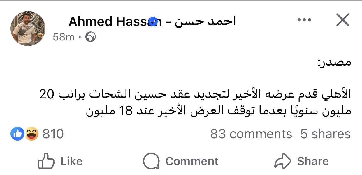 وكتب أحمد حسن، عبر حسابه الشخصي بموقع فيسبوك نقلًا عن مصدر داخل النادي: "الأهلي قدم عرضه الأخير لتجديد عقد حسين الشحات براتب 20
