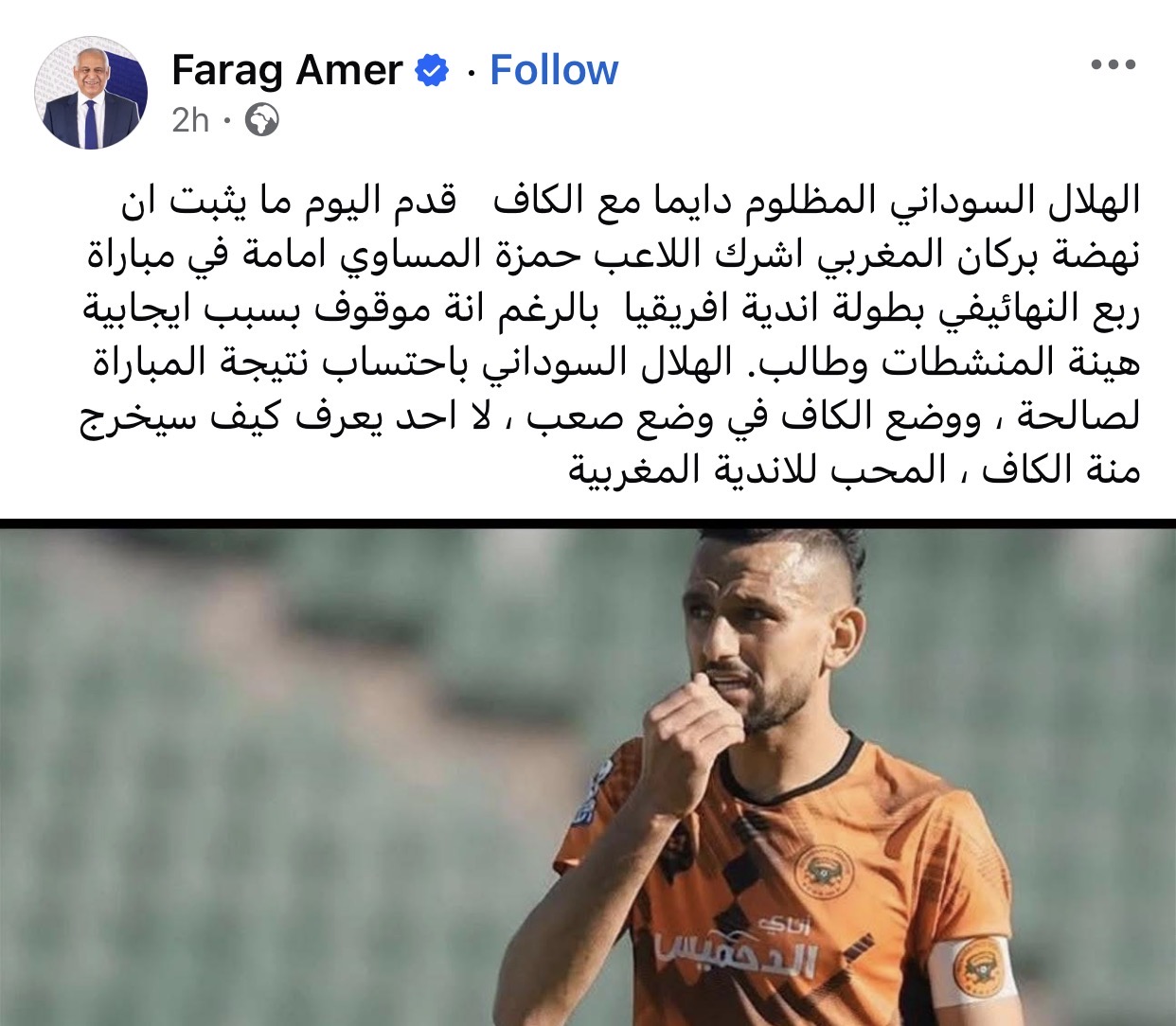 وطالب فرج عامر بـ”احتساب نتيجة المباراة لصالح الهلال السوداني”، مشيرًا إلى أن هذا يضع الاتحاد الإفريقي لكرة القدم (الكاف) في موقف صعب، معبرًا عن قلقه من تحيز الكاف للأندية المغربية.