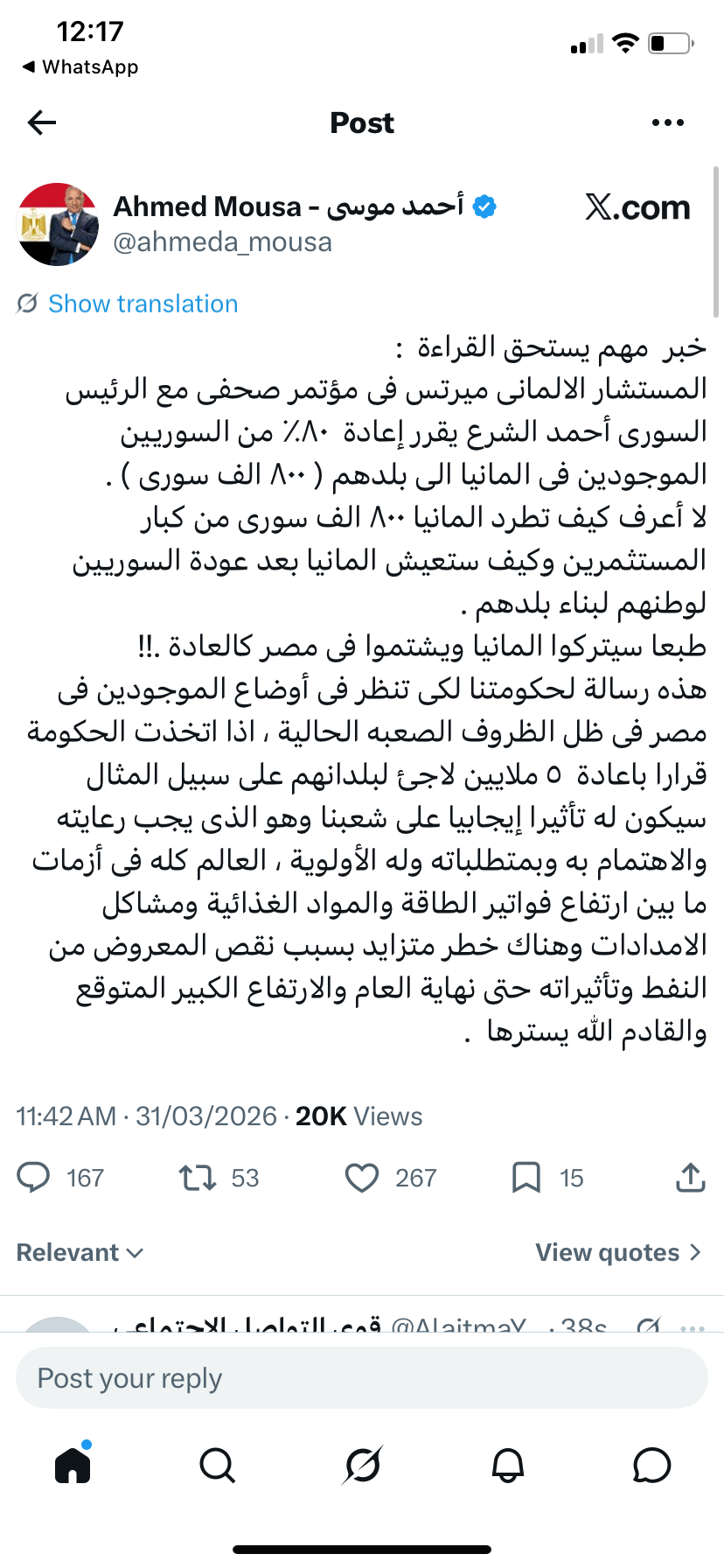 وكتب أحمد موسي عبر حسابه علي موقع التواصل الإجتماعي اكس :"خبر مهم يستحق القراءة :المستشار الألمانى ميرتس فى مؤتمر صحفى مع الرئيس السورى أحمد الشرع يقرر إعادة ٨٠٪ من السوريين الموجودين فى المانيا إلى بلدهم ( ٨٠٠ الف سورى ) .