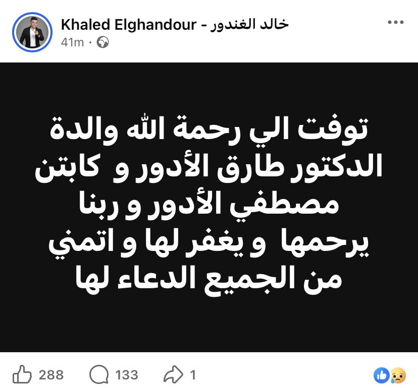 وكتب الإعلامي خالد الغندور، عبر حسابه علي موقع موقع التواصل الإجتماعي فيسبوك:"والدة توفت الي رحمة الله والدة الدكتور طارق الأدور و كابتن مصطفي الأدور و ربنا يرحمها و يغفر لها و اتمني من الجميع الدعاء لها".