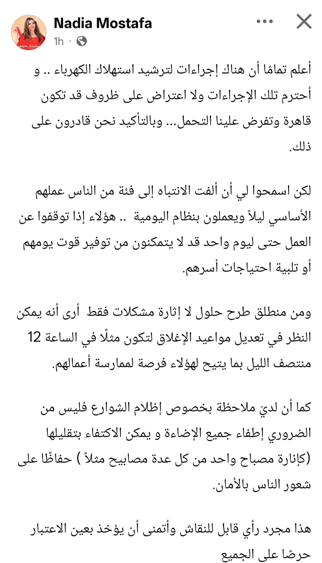 و كتبت نادية مصطفي: أعلم تمامًا أن هناك إجراءات لترشيد استهلاك الكهرباء و أحترم تلك الإجراءات ولا اعتراض على ظروف قد تكون قاهرة وتفرض علينا التحمل… وبالتأكيد نحن قادرون على ذلك.