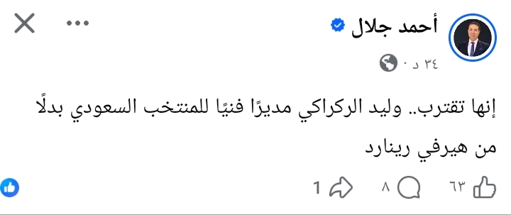 وكتب جلال عبر حسابه على فيسبوك "إنها تقترب.. وليد الركراكي مديرًا فنيًا للمنتخب السعودي بدلًا من هيرفي رينارد"