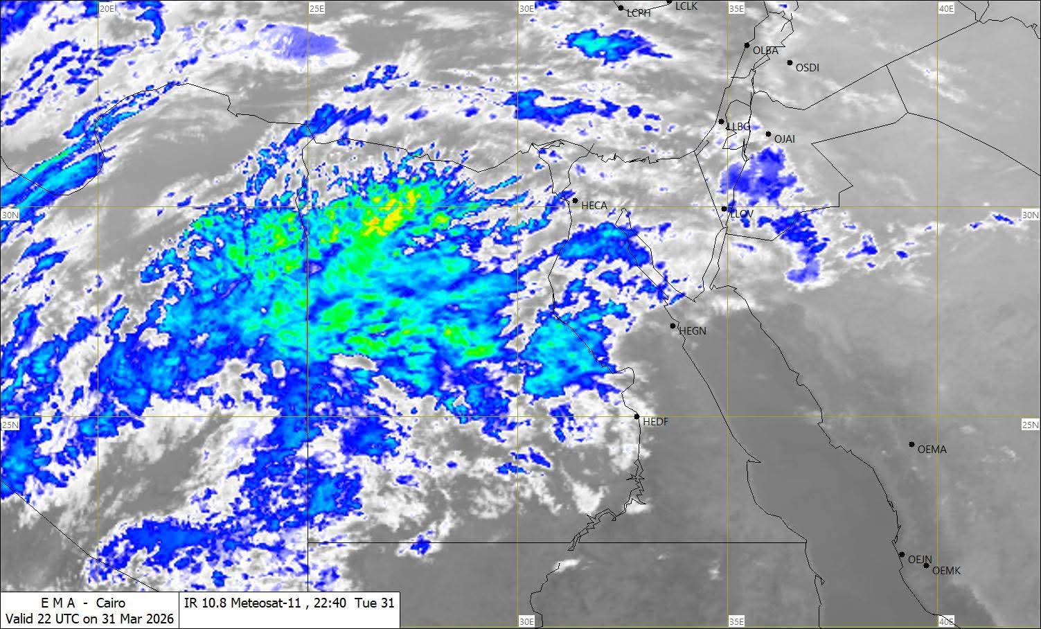 نوّهت هيئة الأرصاد الجوية بوجود غطاء سحابي ممطر على مناطق من الصحراء الغربية وغرب البلاد، يصاحبه سقوط أمطار متفاوتة الشدة، وفقًا لآخر صور الأقمار الصناعية.