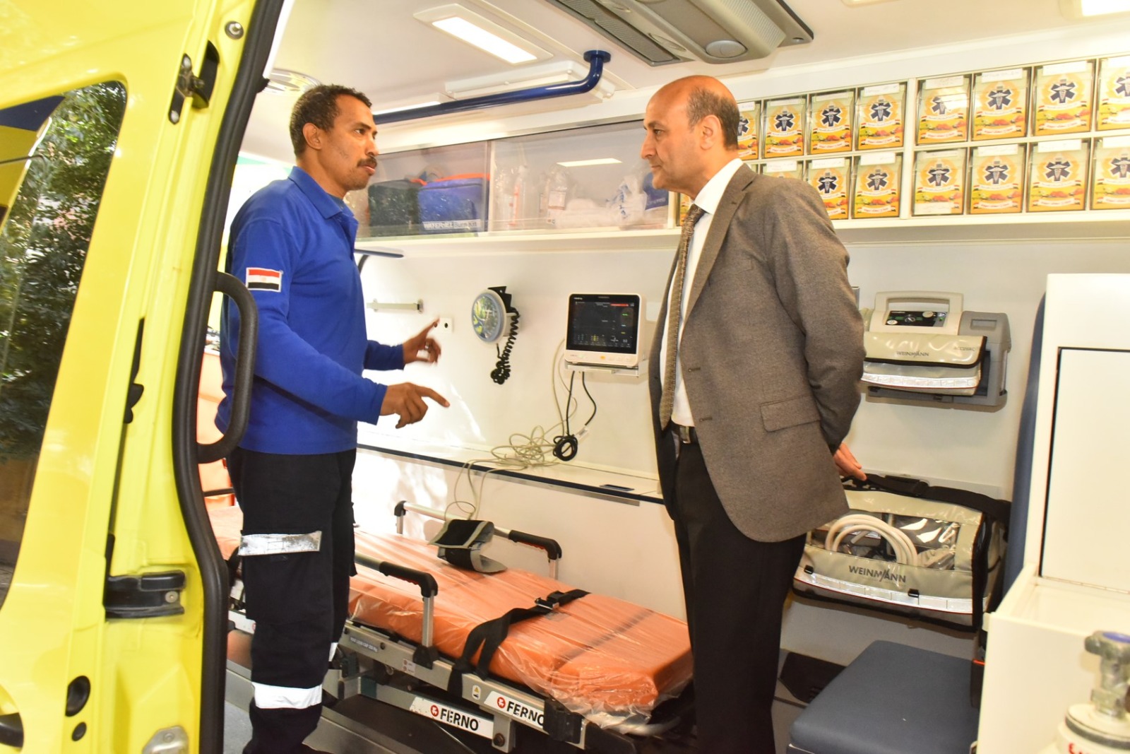كما شملت الجولة تفقد سيارات الإسعاف المتمركزة بالموقع، والتي يبلغ عددها ثلاث سيارات مجهزة بأحدث الإمكانيات الطبية، من بينها سيارة حضانة مخصصة لنقل الأطفال المبسترين مزودة بكبسولة حديثة وأجهزة تنفس صناعي، إلى جانب سيارتين مجهزتين كوحدات عناية مركزة متنقلة، تحتويان على أجهزة إنعاش قلبي رئوي، وأجهزة صدمات كهربائية، وأجهزة متابعة حيوية (مونيتور)، فضلًا عن أجهزة رسم القلب.
