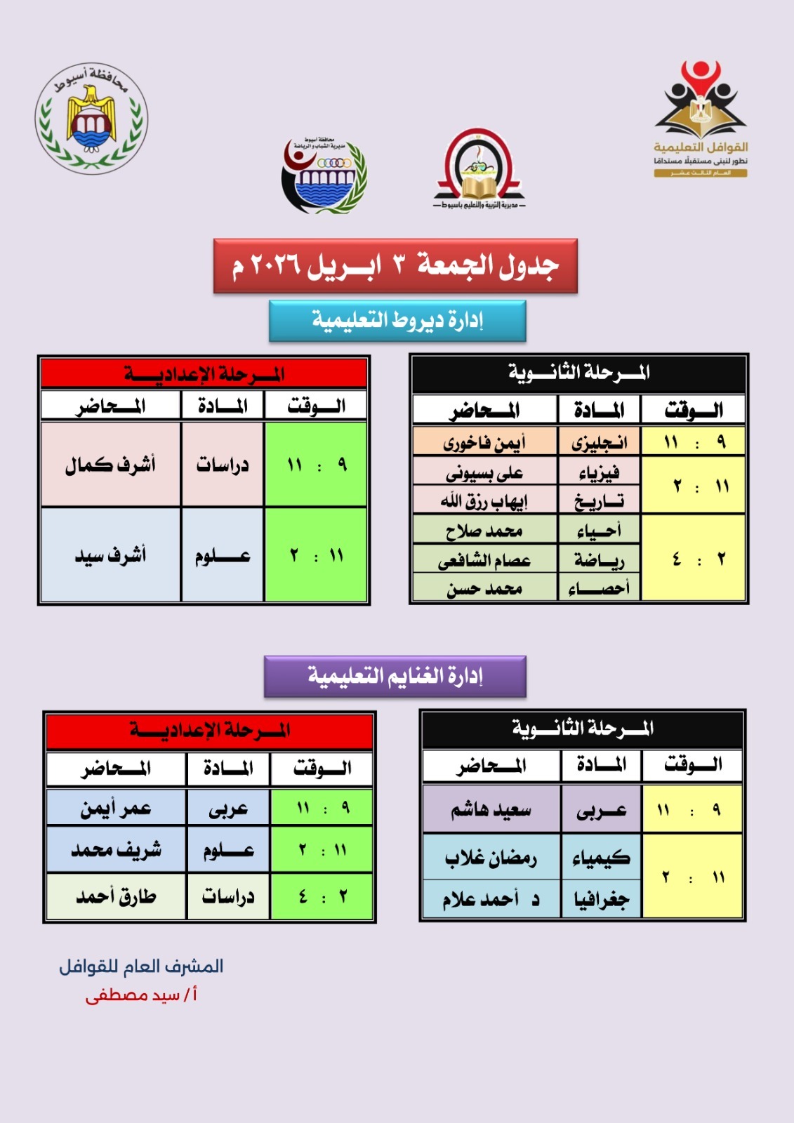 وأوضح المحافظ أنه تلقى تقريرًا مشتركًا من مديرية الشباب والرياضة برئاسة أحمد سويفي، ومديرية التربية والتعليم برئاسة محمد إبراهيم دسوقي، بشأن قيام الإدارة المركزية للتعليم المدني بوزارة الشباب والرياضة بتنفيذ قوافل تعليمية لطلاب الشهادة الإعدادية والثانوية بشعبتيها العلمي والأدبي، وذلك يومي الخميس والجمعة 2 و3 أبريل 2026، بدءًا من الساعة 9 صباحًا، بمركزي ديروط والغنايم.