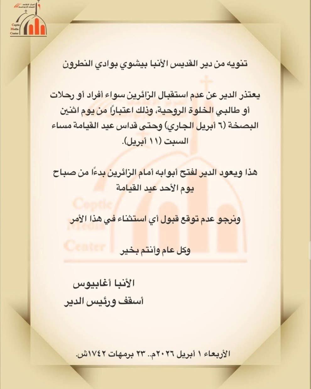 كما ناشد الدير الجميع الالتزام بهذا القرار، مؤكدًا عدم إمكانية قبول أي استثناءات خلال هذه المدة، مختتما بيانه بتهنئة الجميع مقدما بعيد القيامة المجيد.