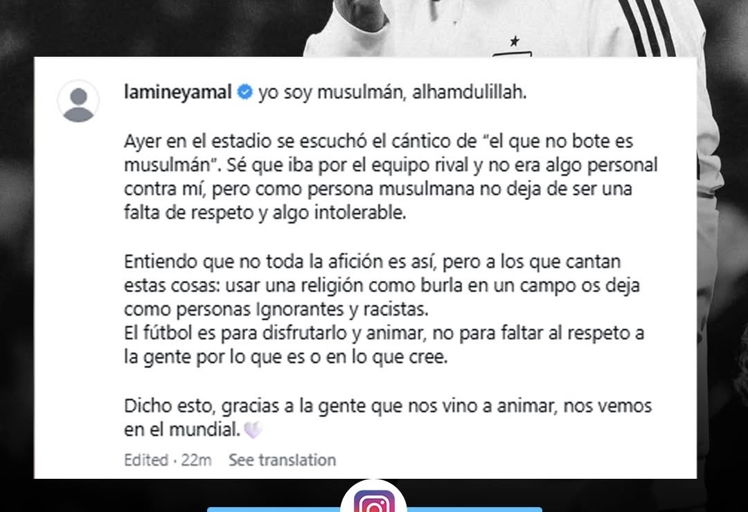 وكتب لامين يامال عبر حسابه على موقع التواصل الاجتماعي "إنستجرام": "مسلم والحمد لله، بالأمس في الملعب، سُمع هتافا مسيئا، وأعلم أنه كان موجها للفريق المنافس ولم يكن موجها لي شخصيا، ولكن بصفتي مسلما، أعتبره تصرفا غير لائق وغير مقبول".