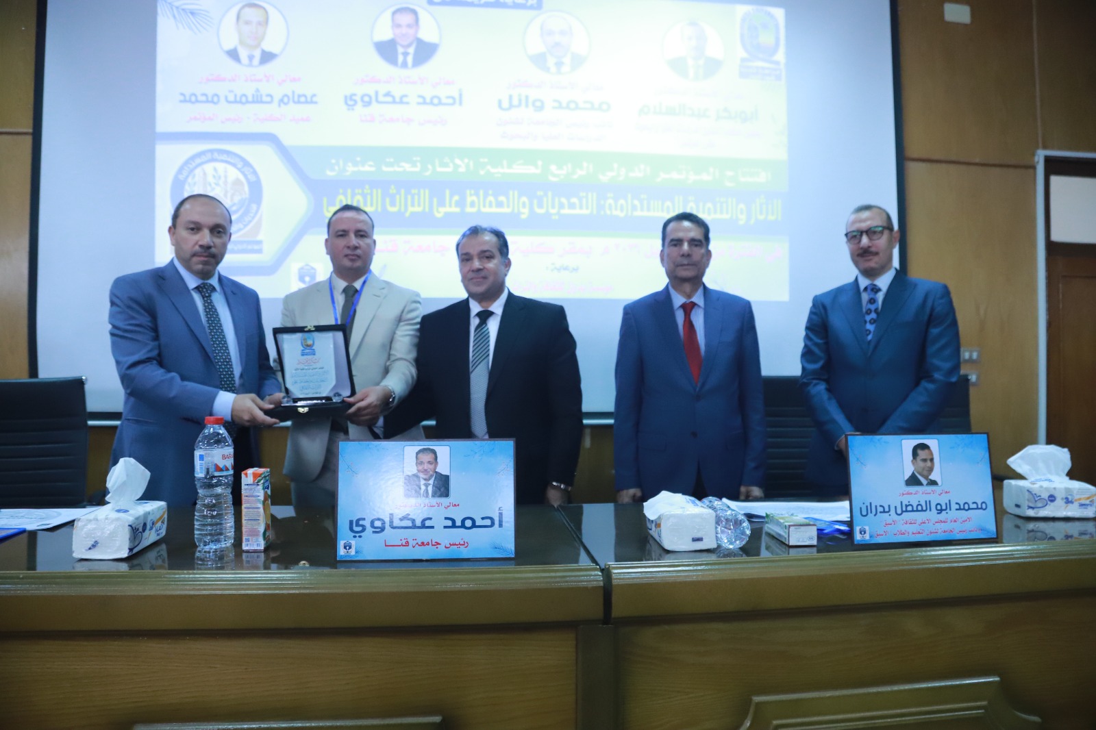 افتتح الدكتور أحمد عكاوي، رئيس جامعة قنا، فعاليات المؤتمر الدولي الرابع لكلية الآثار، الذي يعقد تحت عنوان "الآثار والتنمية المستدامة.. التحديات والحفاظ على التراث الثقافي"، في الفترة من 1- 2 ابريل الجاري ، وذلك بحضور الدكتور عباس منصور رئيس الجامعة الأسبق، الدكتور محمد وائل نائب رئيس الجامعة لشئون الدراسات العليا والبحوث، الدكتور محمد أبو الفضل بدران الأمين العام الأسبق للمجلس الأعلى للثقافة ونائب رئيس الجامعة الأسبق ضيف شرف المؤتمر، الدكتور عصام حشمت، عميد كلية الآثار رئيس المؤتمر، الدكتور أبوبكر عبدالسلام، وكيل الكلية لشئون الدراسات العليا والبحوث ومقرر المؤتمر، الدكتور وائل بكري، عميد كلية الآثار السابق، ووكلاء الكلية، ورؤساء الأقسام، وأعضاء هيئة التدريس، والقيادات الجامعية، والباحثين المشاركين من مصر والدول العربية، وعدد من المهتمين والمتخصصين في مجال الآثار والتراث الثقافي.