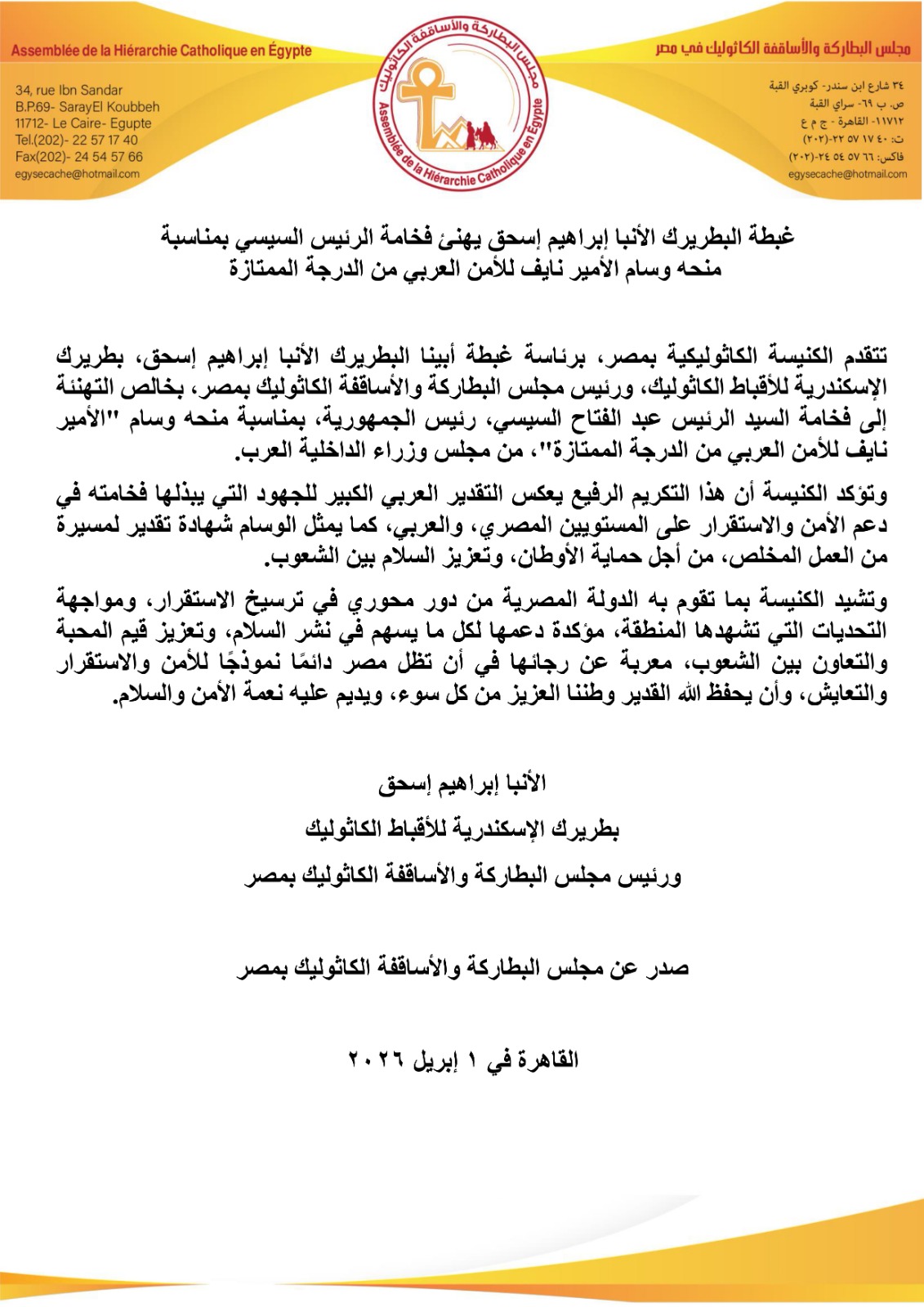 تتقدم الكنيسة الكاثوليكية بمصر، برئاسة غبطة البطريرك الأنبا إبراهيم إسحق، بطريرك الإسكندرية للأقباط الكاثوليك، ورئيس مجلس البطاركة والأساقفة الكاثوليك بمصر، بخالص التهنئة إلى الرئيس عبد الفتاح السيسي، رئيس الجمهورية، بمناسبة منحه وسام "الأمير نايف للأمن العربي من الدرجة الممتازة"، من مجلس وزراء الداخلية العرب.