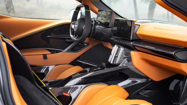 بالاضافة إلي ان سيارة أستون مارتن فالهالا الهايبرد بها، شاشات رقمية توفر كافة المعلومات التقنية والكهربائية، وتم استخدام مكثف للمواد الخفيفة مثل الكانتارا وألياف الكربون المكشوفة مما يخلق بيئة تجمع بين التقشف الرياضي والرفاهية العصرية.