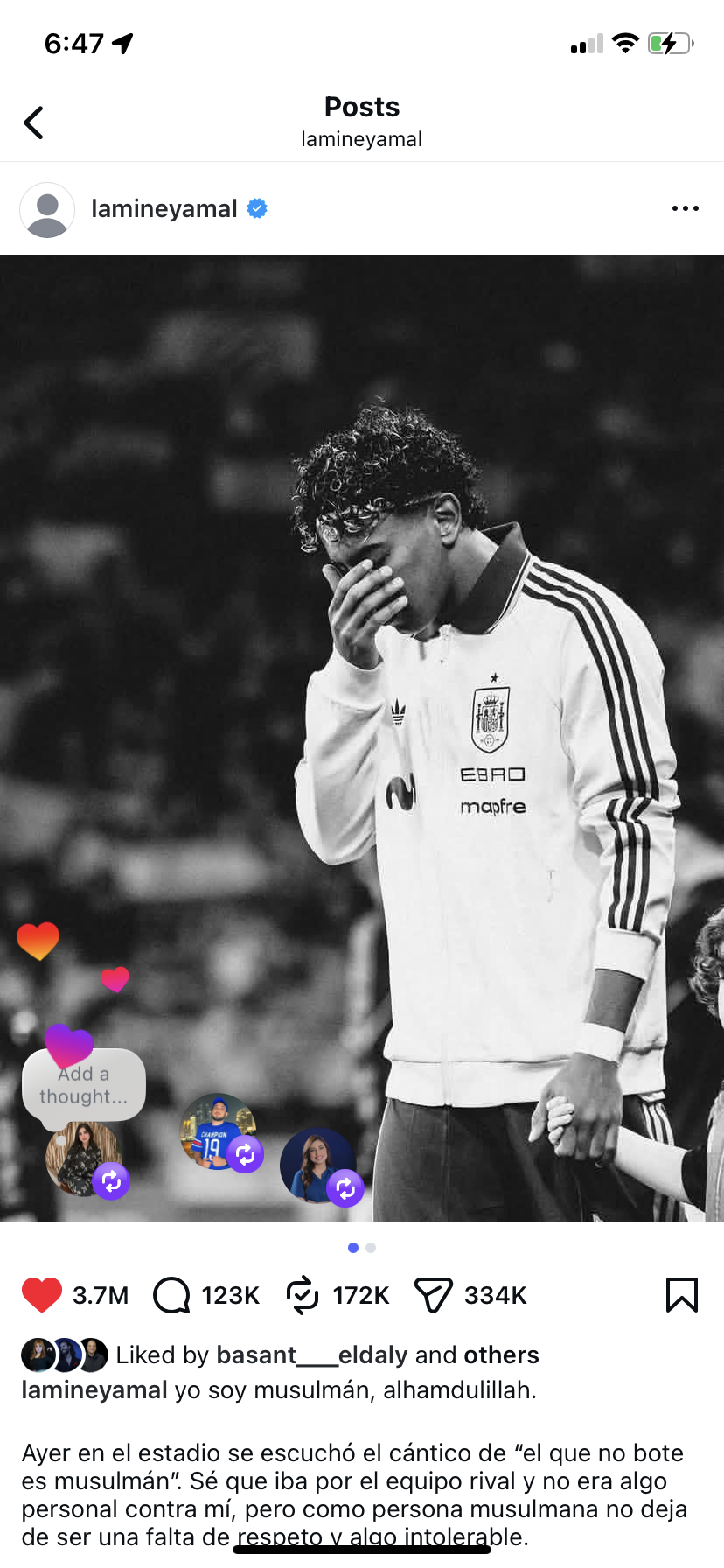 وكتب لامين يامال عبر حسابه على موقع التواصل الاجتماعي "إنستجرام": "مسلم والحمد لله، بالأمس في الملعب، سُمع هتافا مسيئا، وأعلم أنه كان موجها للفريق المنافس ولم يكن موجها لي شخصيا، ولكن بصفتي مسلما، أعتبره تصرفا غير لائق وغير مقبول".