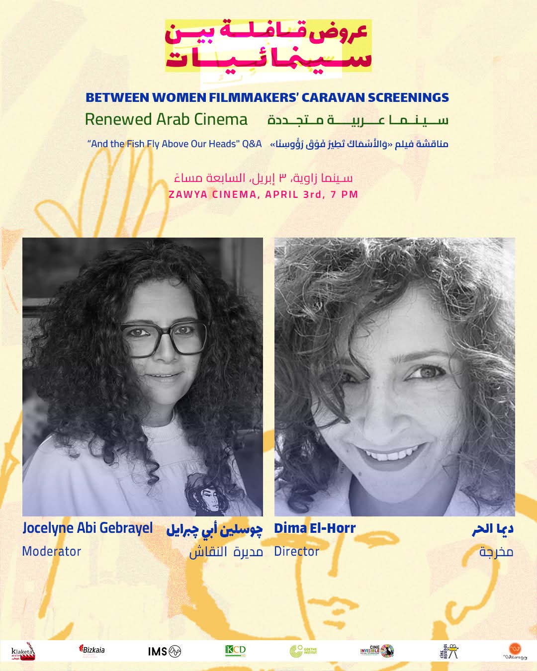 ويعقب العرض لقاء مع مخرجة الفيلم ديمة الحر في بيروت تديره من القاهرة مديرة التصوير اللبنانية جوسلين أبي جبرائيل، في وجود المخرجة أمل رمسيس مؤسسة قافلة بين سينمائيات.