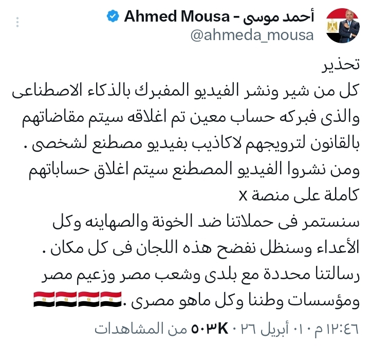 وكتب موسى، عبر حسابه بمنصة «إكس»: "تحذير.. كل من شير ونشر الفيديو المفبرك بالذكاء الاصطناعى والذى فبركه حساب معين تم إغلاقه سيتم مقاضاتهم بالقانون لترويجهم لأكاذيب بفيديو مصطنع لشخصى".