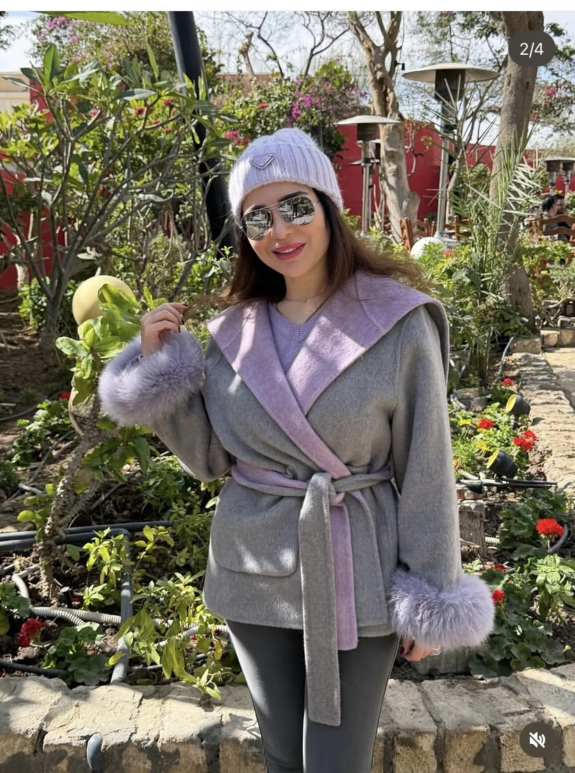 وظهرت مي عز الدين ، مرتديه بالطو باللون الرمادي و الموف ، ونسقت معه بنطال من نفس اللون أيضا ليكشف عن جمالها ورشاقتها.