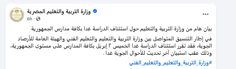 وقالت وزارة التربية والتعليم والتعليم الفني في بيانها الصادر لنفي تعطيل الدراسة في المدارس غداً : في إطار التنسيق المتواصل بين وزارة التربية والتعليم والتعليم الفني والهيئة العامة للأرصاد الجوية، فقد تقرر استئناف الدراسة غدا الخميس ٢ إبريل بكافة المدارس على مستوى الجمهورية، وذلك عقب استبيان آخر تحديث للأحوال الجوية غدا .