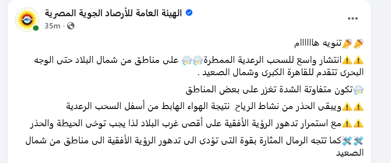 وأعلنت الهيئة العامة للأرصاد الجوية ، انتشار واسع للسحب الرعدية الممطرة ، على مناطق من شمال البلاد حتى الوجه البحرى تتقدم للقاهرة الكبرى وشمال الصعيد ، تكون متفاوتة الشدة تغزر على بعض المناطق