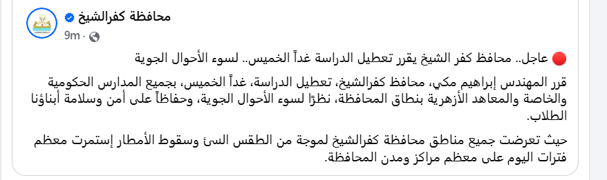 قرر المهندس إبراهيم مكي، محافظ كفرالشيخ، تعطيل الدراسة غداً الخميس، بجميع المدارس الحكومية والخاصة والمعاهد الأزهرية بنطاق المحافظة، نظرًا لسوء الأحوال الجوية، وحفاظاً على أمن وسلامة أبناؤنا الطلاب.
