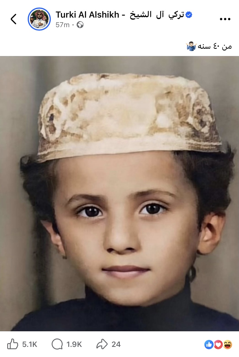 شارك المستشار تركي آل الشيخ رئيس هيئة الترفيه السعودية، متابعيه عبر حسابه الرسمي بموقع التواصل الاجتماعي، صورة له من طفولته.