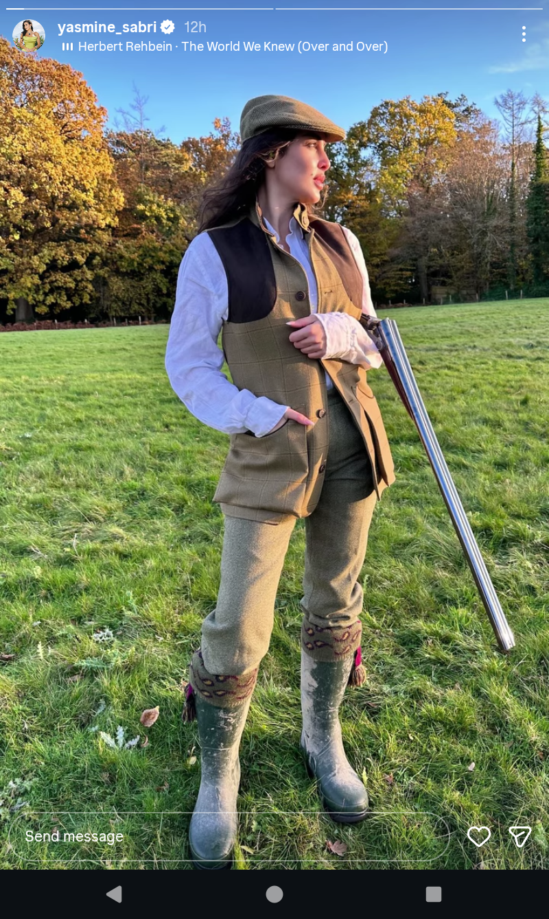 وظهرت ياسمين في الصور بملابس رياضة الصيد، حاملة بندقية.