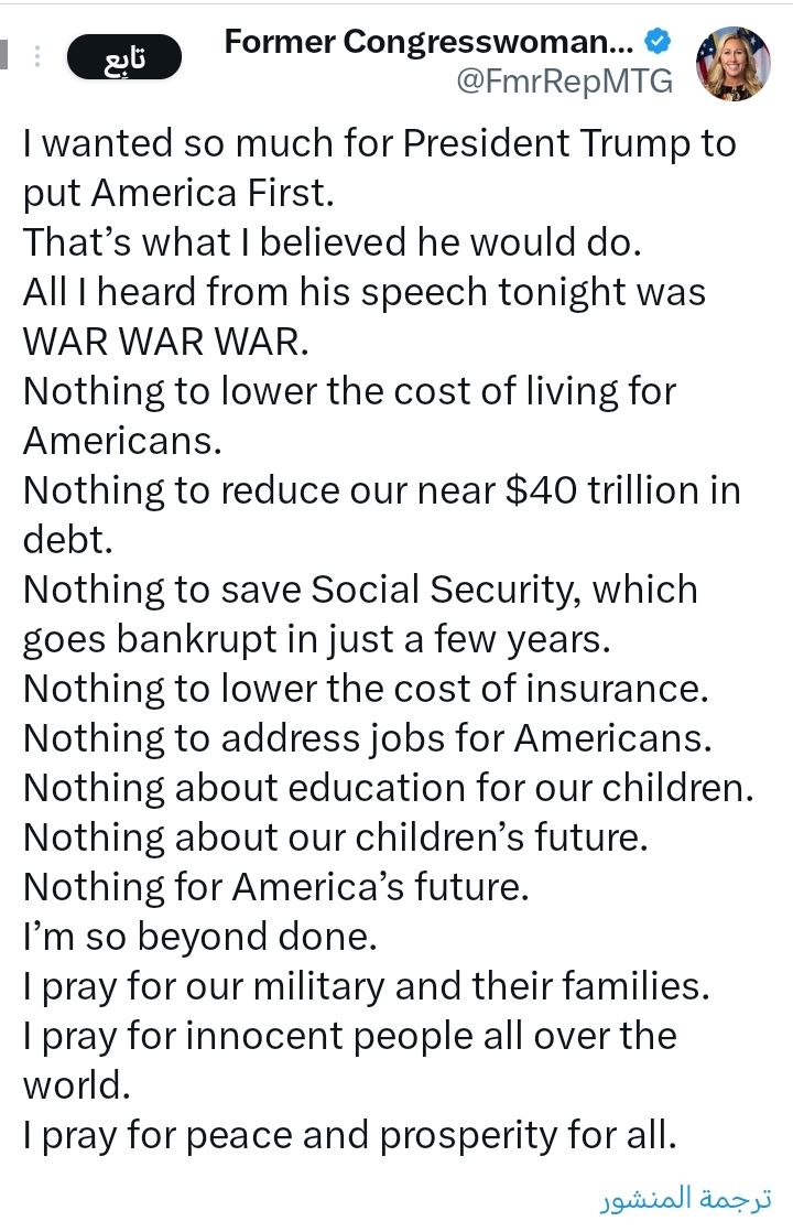 "كنت أتمنى كثيرًا أن يضع الرئيس ترامب أمريكا أولاً، فهذا ما كنت أؤمن أنه سيفعله. لكن كل ما سمعته من خطابه الليلة كان حرب، حرب، حرب.