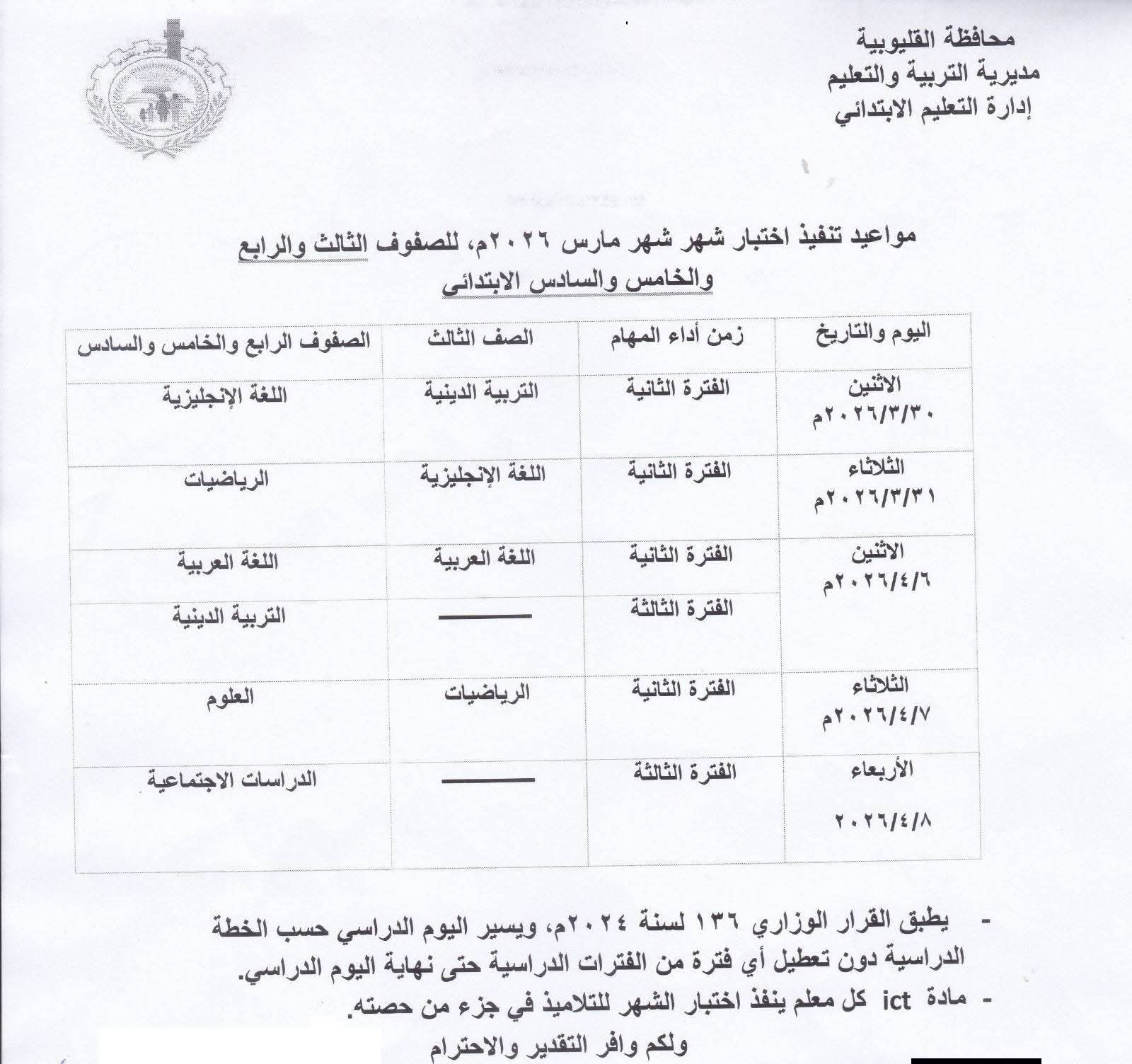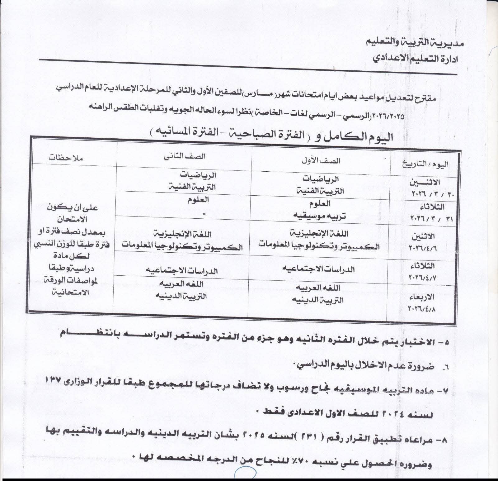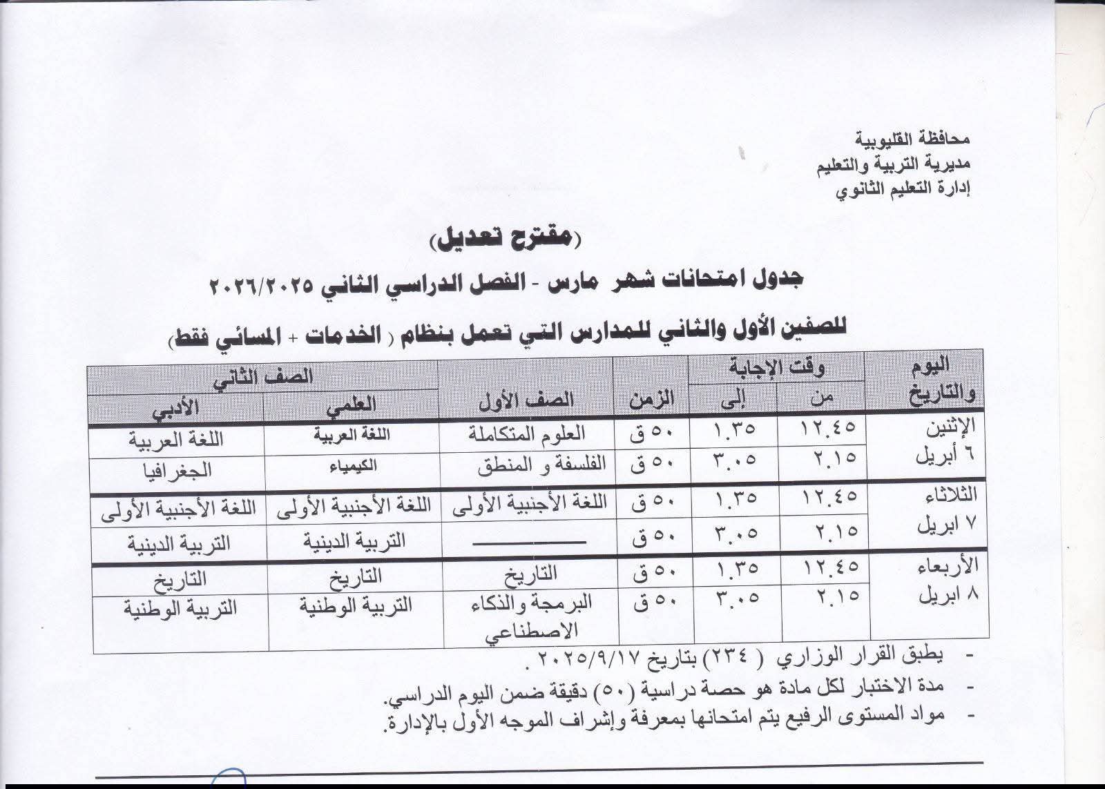 وأوضحت مديرية التربية والتعليم بالقليوبية أنه تقرر تعديل جداول امتحانات شهر مارس في جميع مراحل التعليم الابتدائي والإعدادي والثانوي العام، بسبب ترحيلها إثر تعطل الدراسة بسبب الأمطار والطقس السيئ.